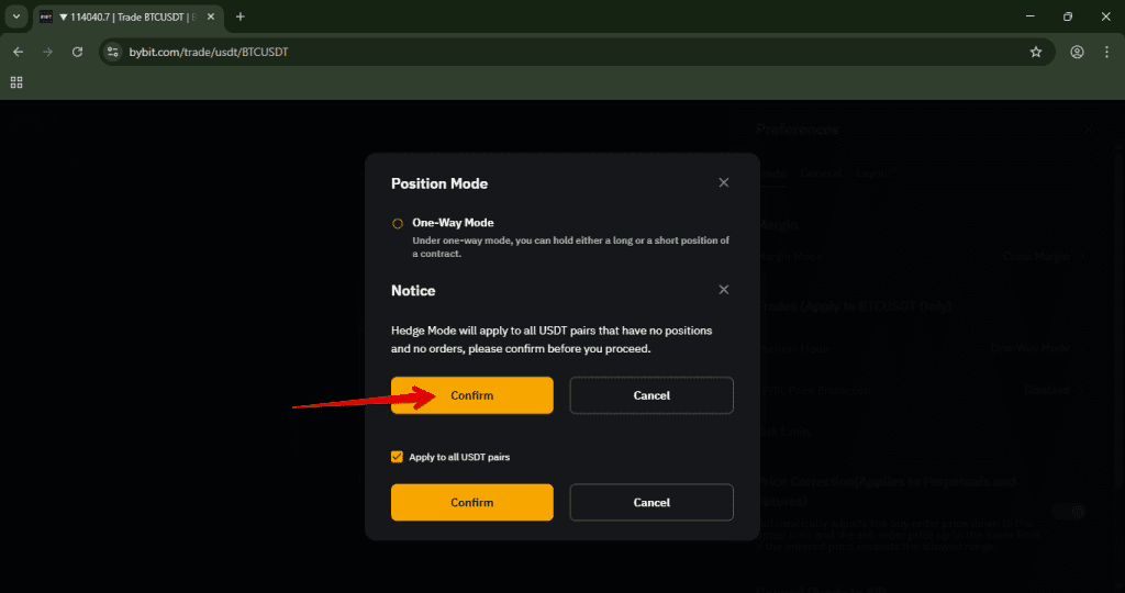 Make sure the “Apply to all USDT pairs” option is checked, then click “Confirm” to apply the settings.