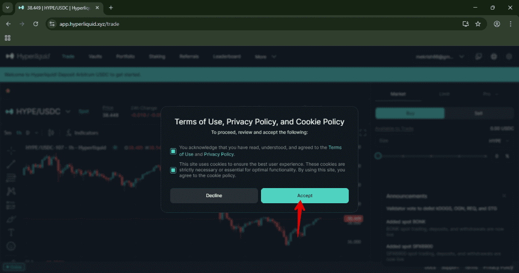 5. Check mark the Terms of use and policy and Click Accept. Your hyperliquid account will be created.