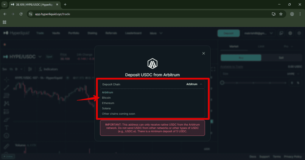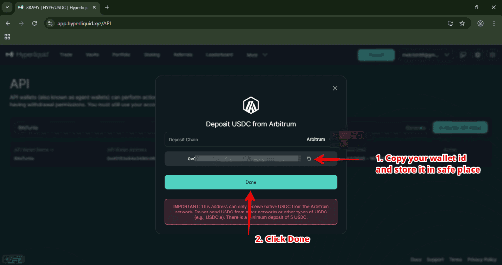 IMPORTANT: Hyperliquid only support USDC so don’t forget to add your funds as USDC not USDT. The wallet address you just created is used to add Funds to your account from another Channels. You will have to send us that wallet address to start and setup your bot.